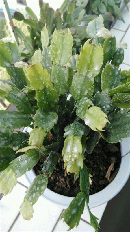 葉片的底部明顯出現(xiàn)了小斑點,,及時噴藥,把斑點較多的枝條剪掉。另外加強通風(fēng),減少澆水,降低空氣濕度。現(xiàn)在是夏天了,天氣炎熱,白瑪麗很容易患各種病。噴灑多菌靈可以有效的預(yù)防,但是對于已經(jīng)患病的蟹爪蘭要噴百菌清。