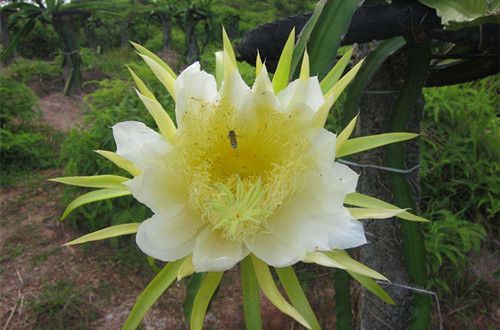 【小貼士】火龍果可自花授粉結實,但異花授粉結實率更高,果大味美,有條件應人工授粉。傍晚花朵盛開時,用一支新毛筆,從一朵花的雄蕊花藥上蘸點花粉,彈在另一朵花的雌蕊柱頭上即可。